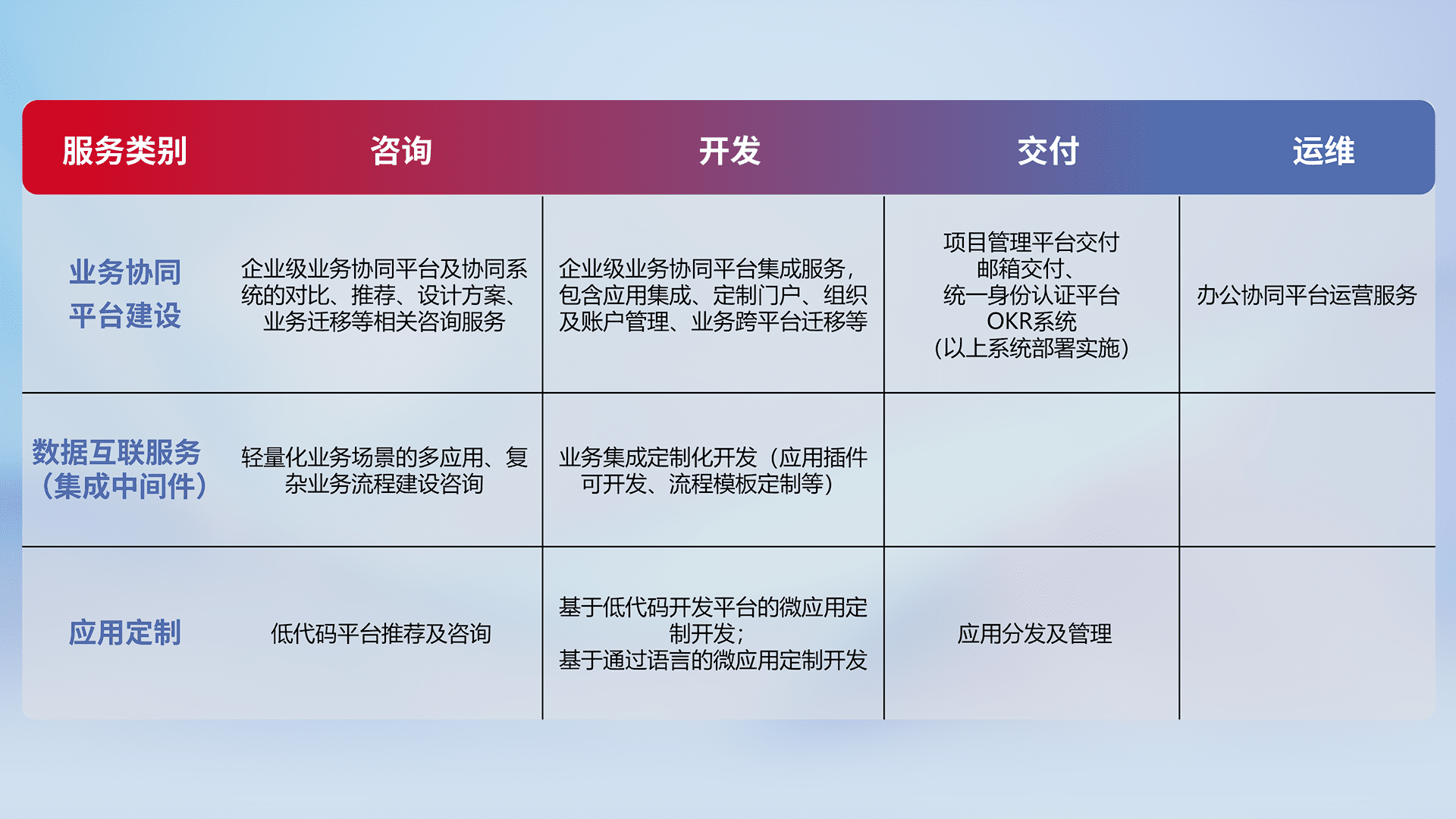 针对钉钉、、企微、、、、IDaas等平台级产品提供产品的规划、、、方案、、交付、、定制化开发等服务,,,,实现如统一协同办公、、、、智能客户服务、、、混合会议管理、、智能数据查询、、等业务场景,,,实现数字化转型。。。